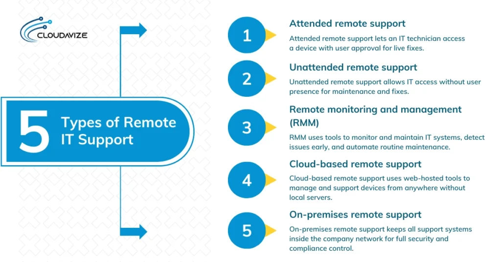 Different types of remote IT support include attended support, unattended support, remote monitoring and management, cloud-based remote support, and on-premises remote support, which are defined by access method and deployment model. Each remote IT support type serves a specific operational role, allowing organizations to select a model that aligns with their security requirements, system complexity, and support workflows.
